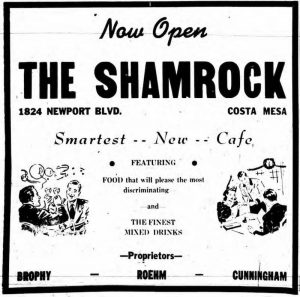 The Shamrock’s story nearly ended before it began. Protests were held, editorials written, and petitions circulated to block its opening. Foes argued “the town already has a sufficient number of liquor-selling establishments to adequately supply the needs of the citizenry.” A. L. Pinkley opposed its nearness to his child-friendly drug store. And W. Carl Spencer worried about “drunken military brawls” that would lead to “Costa Mesa being declared ‘out-of-bounds’ for the decent and respectable soldiers at the base.”